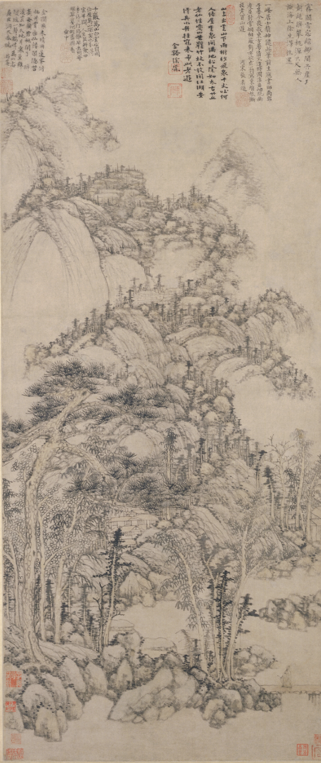 「여산고도 廬山高圖」, 종이에 수묵담채, 193.8x98.1cm, 대만국립고궁박물원 / 「경강송별도권京江送别图卷」부분, 종이에 수묵담채, 28x159cm, 북경고궁박물원, 1491 黃公望皴,仿虞山石面,色善用赭石,淺淺施之,有時再以赭筆勾出大概。