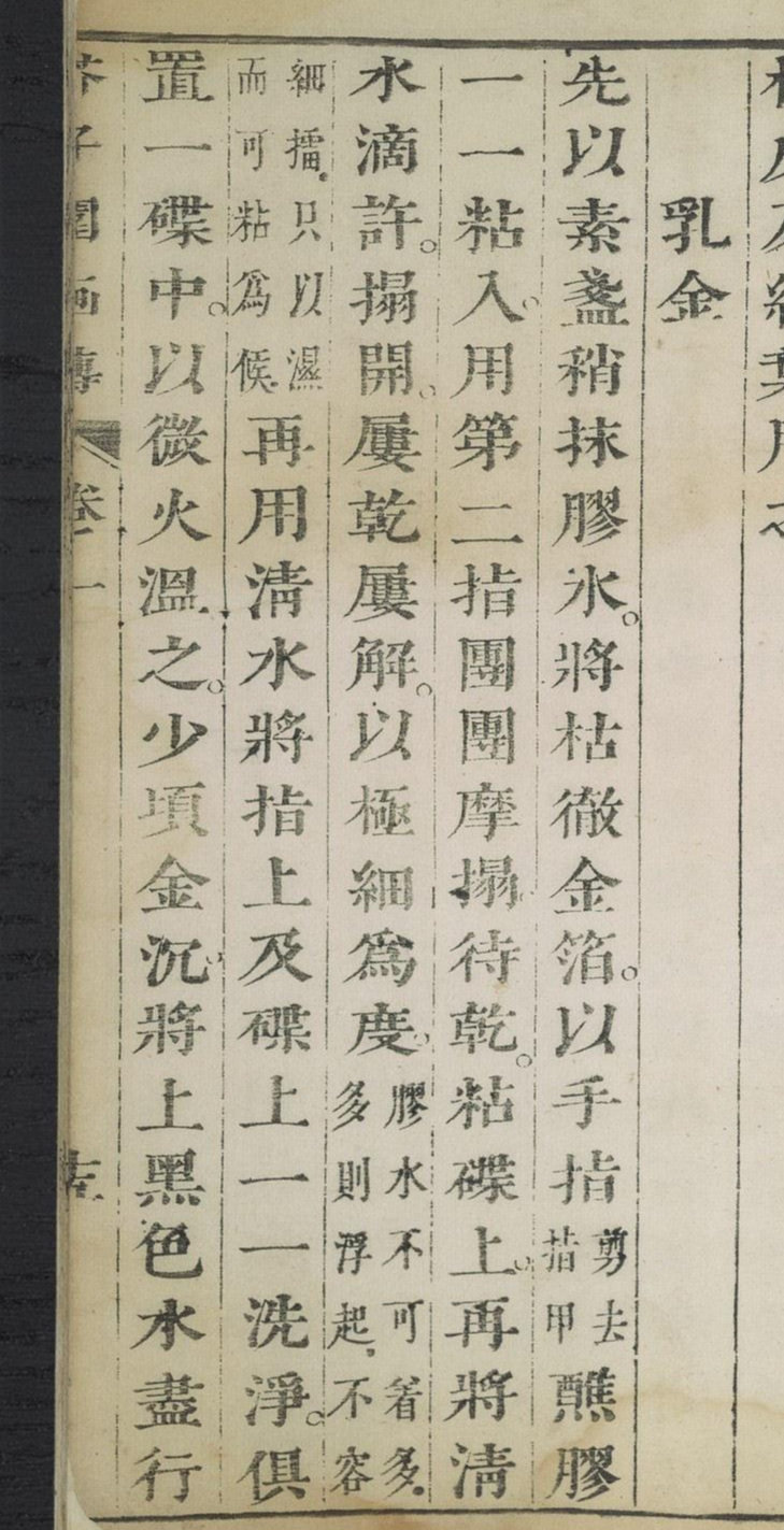 先以素盞稍抹膠水,將枯徹金箔,以手指(剪去指甲),蘸膠一一粘入。用第二指團團摩搨,待乾,粘碟上,再將清水滴許,搨開屢乾屢解,以極細為度。(膠水不可着多,多則就浮起不容細擂,只以濕而可粘爲候) 再用清水將指上,及碟上一一洗凈,俱置一碟中以微火溫之,少頃金沈。將上黑色水盡行傾出,曬乾碟內好金,臨用時稍稍加極清薄膠水,調之,不可多多則金黑無光。又法將肥皂核內剝出白肉,溶化作膠,似更清。