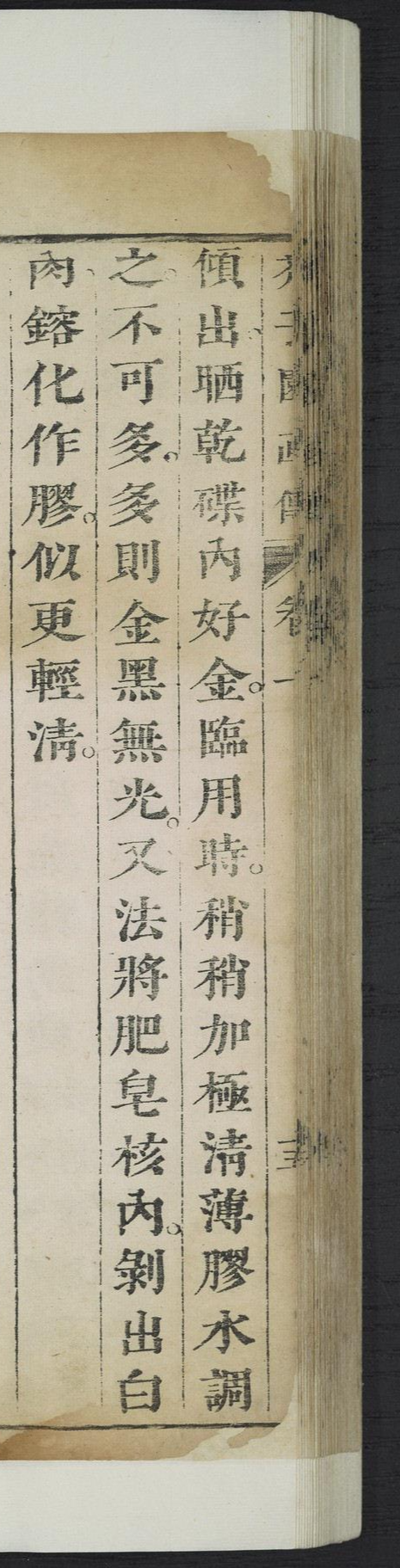 將上黑色水盡行傾出,曬乾碟內好金,臨用時稍稍加極清薄膠水,調之,不可多多則金黑無光。