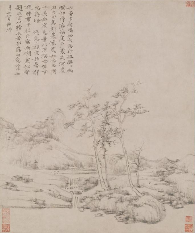 「용승제도容膝齋圖」, 종이에 수묵, 74.7x35.5cm, 대만국립고궁박물원 / 「강안망산도江岸望山圖」, 종이에 수묵, 111.3x33.2cm, 대만국립고궁박물원 / 「유간한송도, 幽澗寒松圖」, 59.7x50.4, 종이에 수묵, 북경고궁박물원 文衡山行款清整,沈石田筆法灑落,徐文長詩歌奇橫,陳白陽題誌精卓,每侵畫位翻多寄趣。
