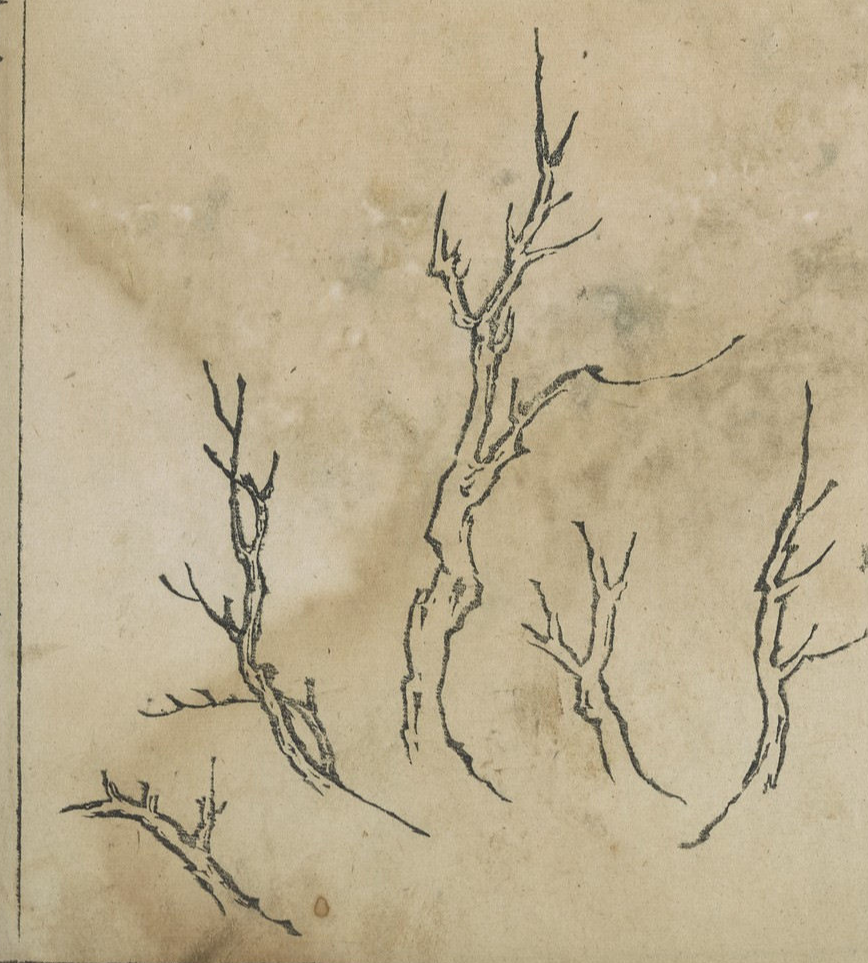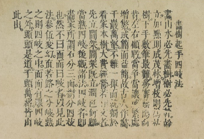 【원문】 畫樹起手四岐法畫山水必先畫樹,樹必先幹,幹立加點則成茂林,增枝則爲枯樹,下手數筆最難。務審陰陽向背左右,顧盼當爭當讓,或繁處增繁或簡而益簡。故古人作畫,千巖萬壑不難ㅡ揮而就,獨於看家本樹大費經營。若作文者先立間架,間架旣立潤色何難。當熟四岐後觀諸法,四岐者卽畫家所謂,石分三面樹分四枝也。然不曰面而曰岐者,以見此法參伍變幻,直若路之分岐熟之。則四岐之中面面有眼,四岐之外頭頭是道,千頭萬緖皆由此出。