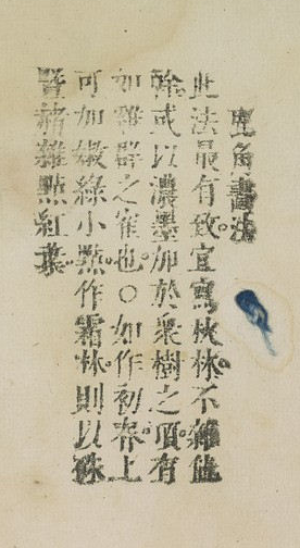 이 법은 아주 운치가 있다. 마땅히 가을 숲을 그리기에 적당한데, 다른 줄기와 섞이지 않고, 혹 뭇 나무의 꼭대기에 농묵이 더해지면, 마치 군계일학(群鷄一鶴)과 같다. 만일 초 봄을 그리고자 하면, 위에 연한 녹색의 작은 점을 더함이 옳다. 서리 맞은 숲을 그리려면, 적색과 자색을 섞어 붉은 잎을 점점이 찍는다.