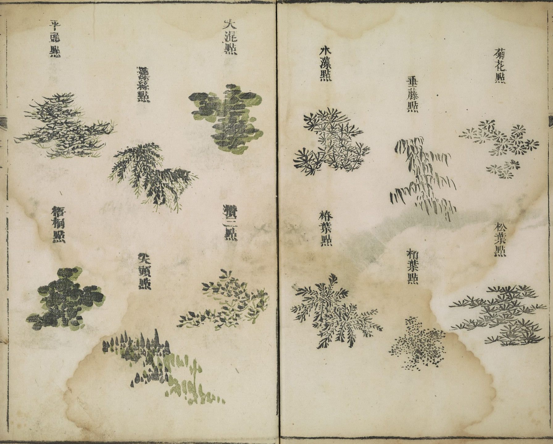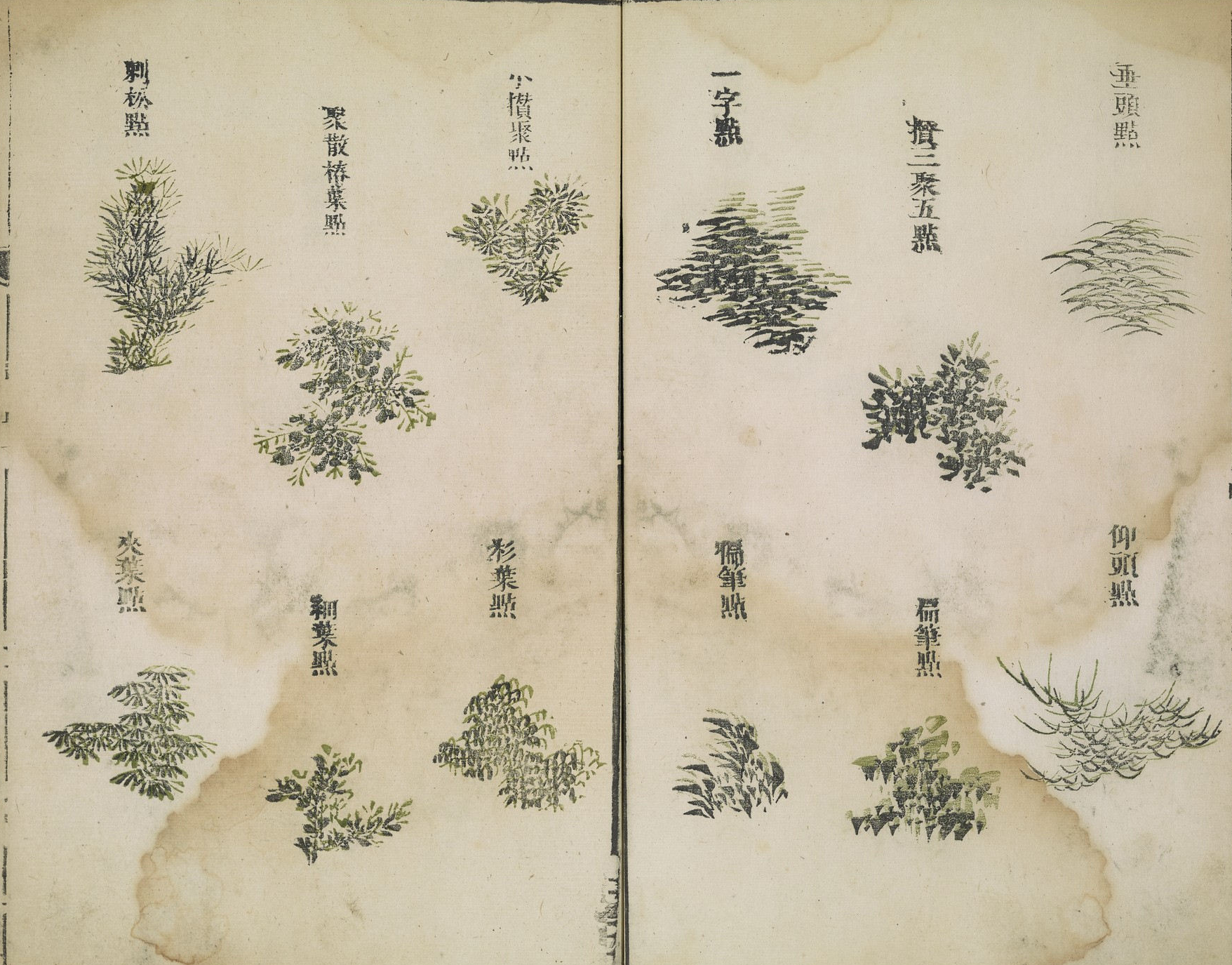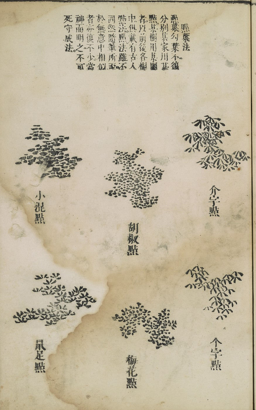 어느 화가가 어떤 점엽을 쓰고, 어느 나무에 어떤 테두리(勾葉)를 치는지, 점엽(點葉)과 구엽(勾葉)이 더 이상 분명치 않은 것은, 전후의 여러 나무에 옛사람의 점법이 모두 실려 있기 때문이다.