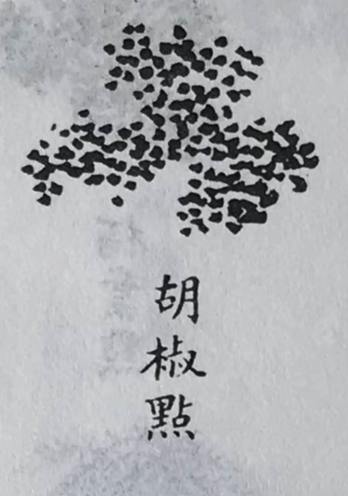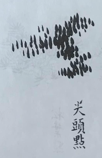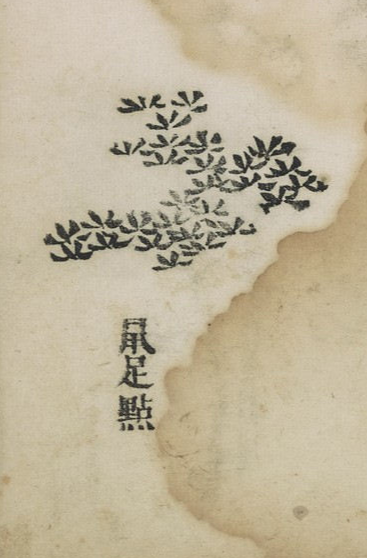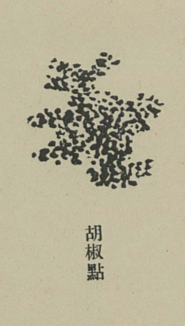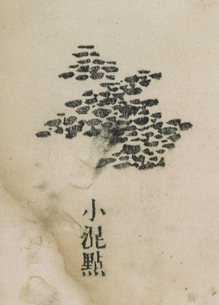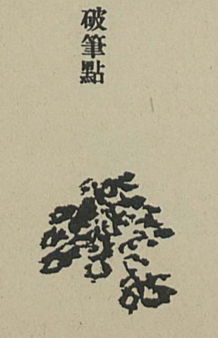 파필점붓 끝이 흐트러진 모양의 점. 잎이 큰 나무를 그리면 자연스레 파필이 형성됨.