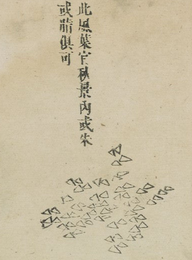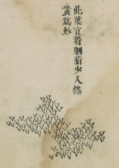 이 잎은 위에 세 잎은 연지를 칠해야하고, 아래 잎은 짙은 녹색을 칠하거나 석록으로 채우거나, (화면의) 반대편에 석록으로 배채하는것 모두 가능하다. 위에 세 잎의 끝에는 등황을 쓰는것도 가능하다. 사라수와 참죽나무, 밤나무에 이르기까지 여러 잎과 닮았다.